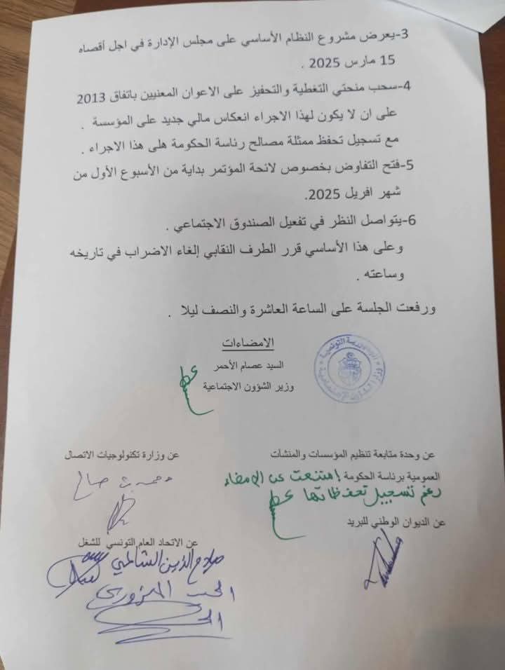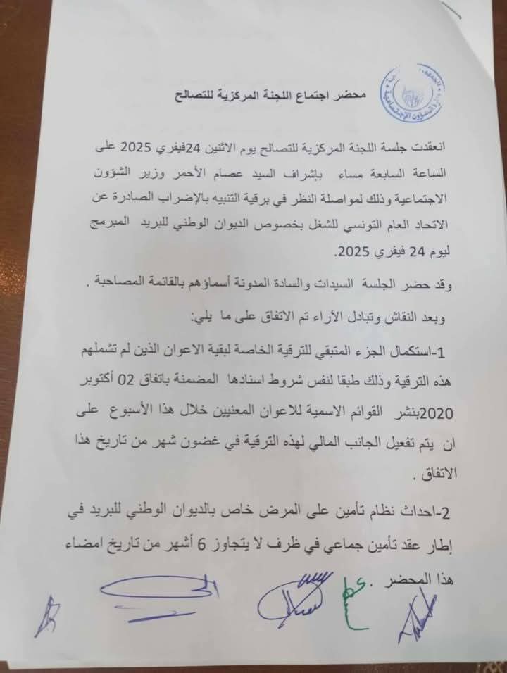 وجاء هذا القرار عقب اجتماع اللجنة المركزية للتصالح، الذي أشرف عليه وزير الشؤون الاجتماعية عصام الأحمر، بحضور الأمين العام المساعد المسؤول عن قسم القطاع العام بالاتحاد، صلاح الدين السالمي، إلى جانب أعضاء الجامعة العامة للبريد، يتقدمهم الكاتب العام الحبيب الميزوري، وممثلين عن الإدارة العامة للبريد وسلطة الإشراف.