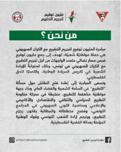 في ما يلي بيان مبادرة مليون توقيع من أجل تجريم التطبيع، الذي تحصلت توميديا على نسخة منه: