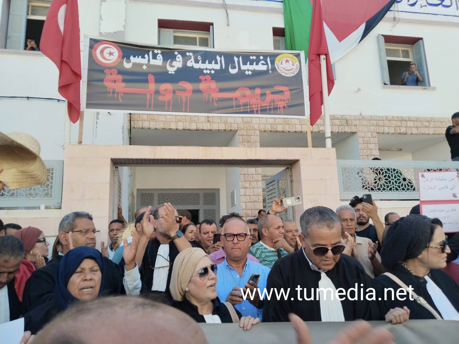غير بعيد عن مقر الاتحاد، كانت المحكمة الابتدائية بقابس قد توشحت بالأبيض والأسود، حيث خرج المحامون تحت لواء هيئتهم الفرعية في مسيرة التقت مع المحتجين أمام الاتحاد.