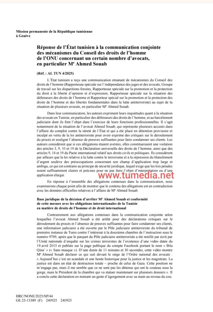 تحصل موقع توميديا على وثائق خاصة حول رد الدولة التونسية على مراسلة آليات مجلس حقوق الإنسان حول المحامي أحمد صواب بعد ان كانت الأمم المتحدة  قد أعربت عن قلقها بشأن ملاحقة بعض المحامين في تونس، وخاصة المحامي أحمد صواب، معتبرة أن هناك شبهات مضايقة أو انتهاك لحرية التعبير والدفاع.