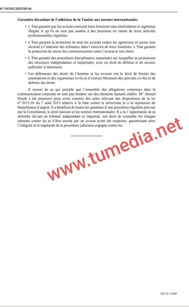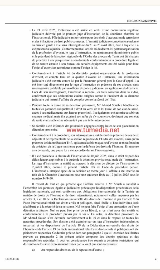 كما أكدت تونس أن المحامي صواب تمتع بكافة الضمانات القانونية منذ توقيفه في 21 أفريل 2025، بما في ذلك حقه في محامٍ، وإبلاغ أسرته، ومراعاة حالته الصحية، وإجراءات التفتيش القانوني لمكتبه ومنزله بحضور ممثلين عن نقابة المحامين