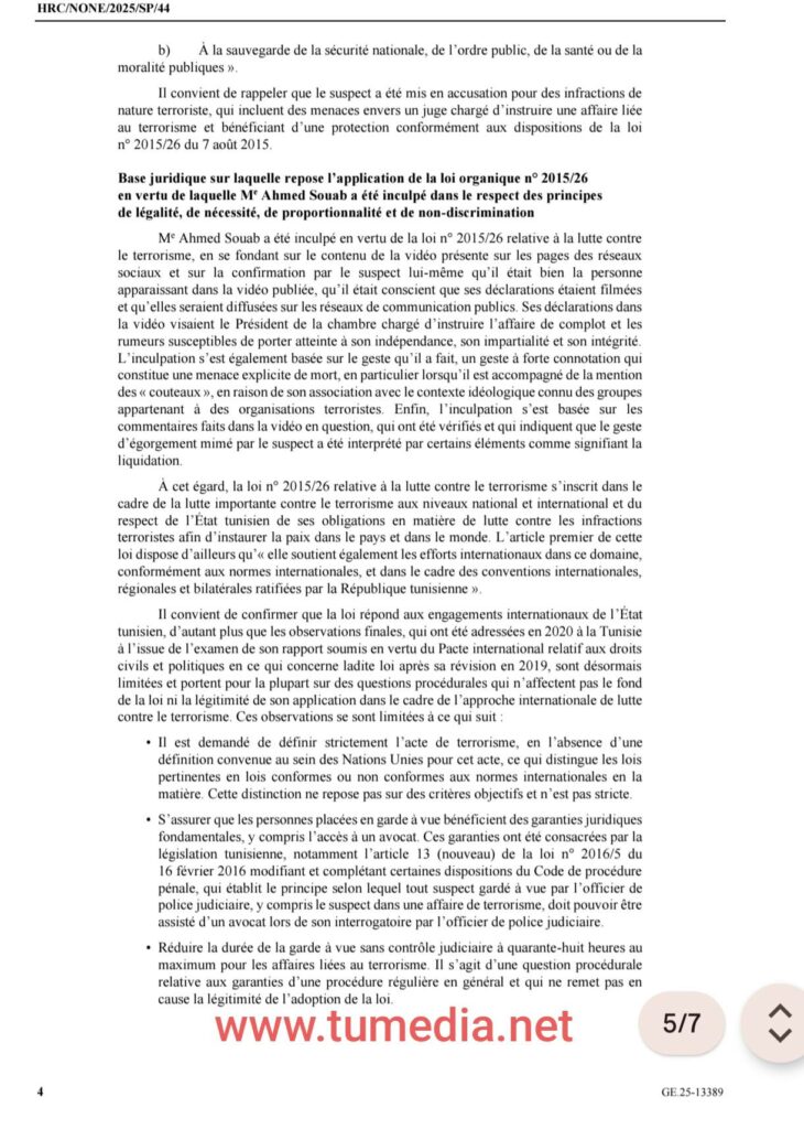 و تعتبر تونس أن جميع الادعاءات التي وجهتها الأمم المتحدة لا تستند إلى وقائع صحيحة،وأن إيقاف أحمد الصواب قانوني ويتعلق بأفعال إرهابية وتهديدات بالقتل،