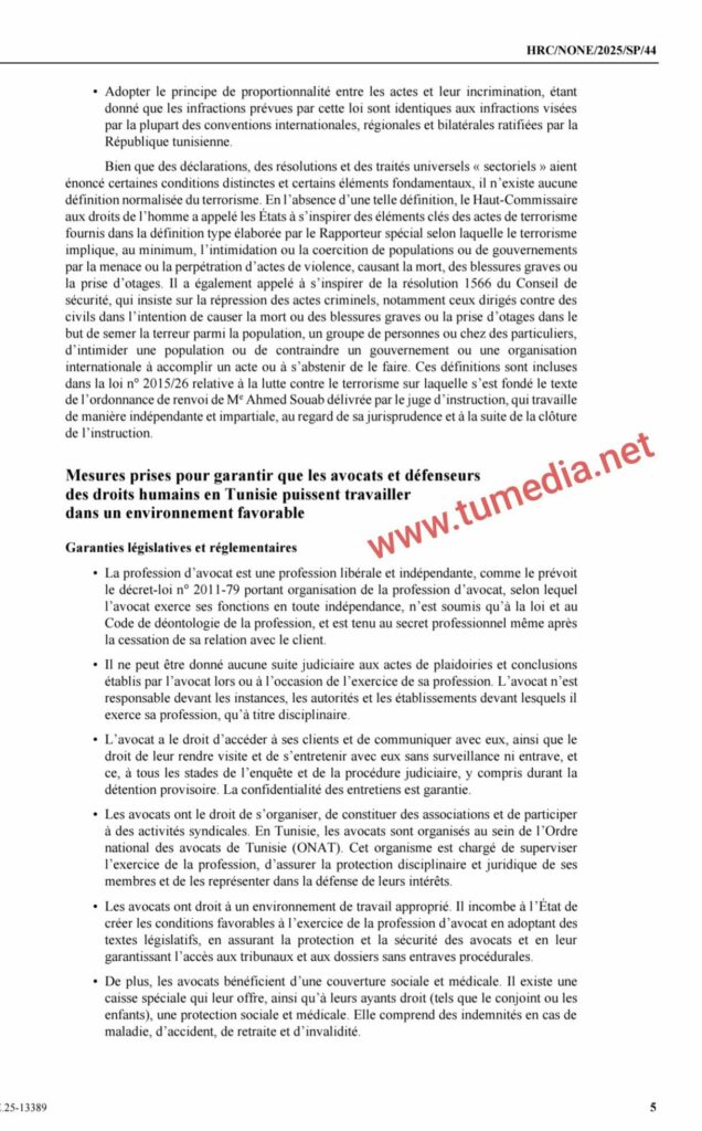و قد نفت تونس لأي شكل من أشكال الاضطهاد ضد المحامين أو المدافعين عن حقوق الإنسان مؤكدة أن البلاد تحترم التزاماتها الدولية في ما يتعلق بالحقوق والحريات الأساسية.