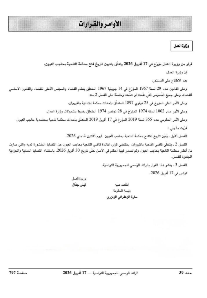 صدر بالرائد الرسمي للجمهورية التونسية عدد 39 بتاريخ 17 أفريل 2026 قرار عن وزارة العدل يقضي بتحديد تاريخ افتتاح محكمة الناحية بمعتمدية حاجب العيون، وذلك ابتداءً من يوم الاثنين 4 ماي 2026، في خطوة تهدف إلى دعم البنية القضائية وتسهيل النفاذ إلى العدالة.