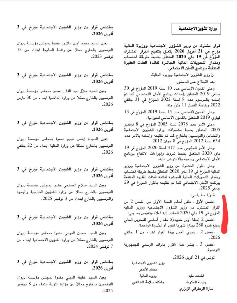 صدر بالرائد الرسمي للجمهورية التونسية بتاريخ 21 أفريل 2026 قرار مشترك عن وزير الشؤون الاجتماعية ووزيرة المالية يقضي بمراجعة مقدار المساعدة المالية الموجهة للتلاميذ ضمن برنامج الأمان الاجتماعي، في خطوة تهدف إلى تعزيز الإحاطة بالفئات الهشة وتحسين ظروف التمدرس.